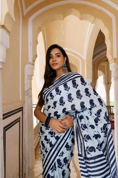 Vasudha Indigo Handblock Mulmul Cotton Saree – Heritage Blooms in Every Drape